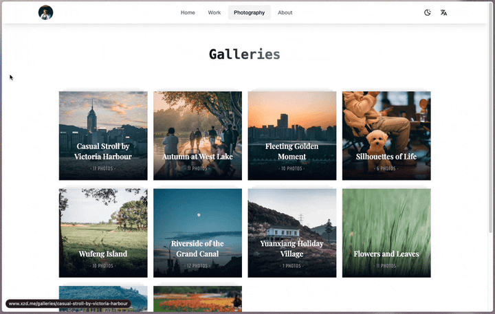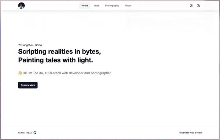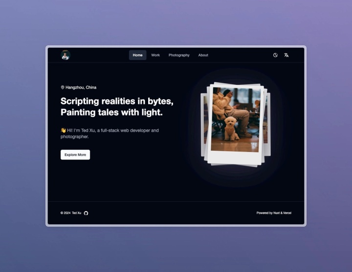 From a UI design perspective, I drew inspiration from several websites and small projects to implement some interesting effects, such as interactive Polaroid photos on the homepage, transition animations when switching between dark/light modes, and vivid album covers on the "Photography" page. I would like to extend my gratitude to these projects for inspiring me.