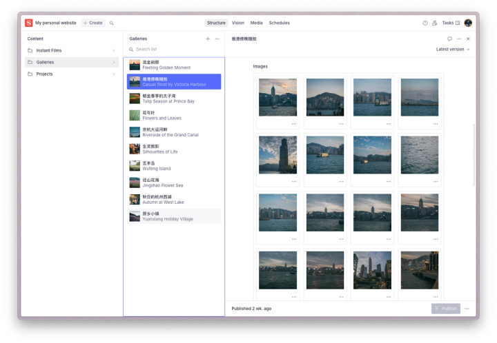From a content management perspective, this project was my first time using a CMS. The CMS chosen for this project is Sanity. The primary reason for this choice is its out-of-the-box support for reading exif information from uploaded images. Below is the content management interface of Sanity for this project: